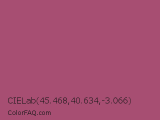 CIELab 45.468,40.634,-3.066 Color is a normal rose color and the nearest color is China Rose #a8516e. Hex code #a74e72 and RGB value is rgb(167,78,114). In RGB color space, this color is composed of 65% red, 31% green, 45% blue, In CMYK color space, this color is composed of 0% cyan, 53% magenta, 32% yellow , 35% black , In HSL color space, this color has a hue angle of 336° , 36% saturation and 48% lightness.