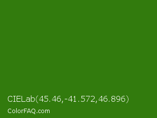 CIELab 45.46,-41.572,46.896 Color is a dark green color and the nearest color is Bilbao #327c14. Hex code #327b0d and RGB value is rgb(50,123,13). In RGB color space, this color is composed of 20% red, 48% green, 5% blue, In CMYK color space, this color is composed of 59% cyan, 0% magenta, 89% yellow , 52% black , In HSL color space, this color has a hue angle of 100° , 81% saturation and 27% lightness.