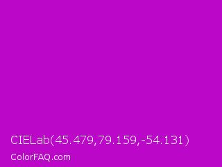 CIELab 45.479,79.159,-54.131 Color is a normal magenta color and the nearest color is Deep Magenta #cc00cc. Hex code #bb07c8 and RGB value is rgb(187,7,200). In RGB color space, this color is composed of 73% red, 3% green, 78% blue, In CMYK color space, this color is composed of 7% cyan, 97% magenta, 0% yellow , 22% black , In HSL color space, this color has a hue angle of 296° , 93% saturation and 41% lightness.