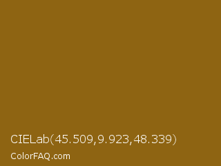 CIELab 45.509,9.923,48.339 Color is a normal orange color and the nearest color is Corn Harvest #8b6b0b. Hex code #8e6412 and RGB value is rgb(142,100,18). In RGB color space, this color is composed of 56% red, 39% green, 7% blue, In CMYK color space, this color is composed of 0% cyan, 30% magenta, 87% yellow , 44% black , In HSL color space, this color has a hue angle of 40° , 78% saturation and 31% lightness.