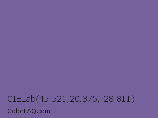 CIELab 45.521,20.375,-28.811 Color is a normal indigo color and the nearest color is Kimberly #736c9f. Hex code #75629c and RGB value is rgb(117,98,156). In RGB color space, this color is composed of 46% red, 38% green, 61% blue, In CMYK color space, this color is composed of 25% cyan, 37% magenta, 0% yellow , 39% black , In HSL color space, this color has a hue angle of 260° , 23% saturation and 50% lightness.