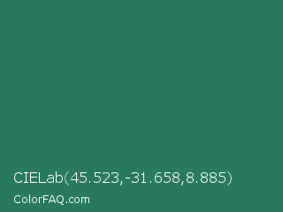 CIELab 45.523,-31.658,8.885 Color is a normal green color and the nearest color is Eucalyptus #278a5b. Hex code #29795c and RGB value is rgb(41,121,92). In RGB color space, this color is composed of 16% red, 47% green, 36% blue, In CMYK color space, this color is composed of 66% cyan, 0% magenta, 24% yellow , 53% black , In HSL color space, this color has a hue angle of 158° , 49% saturation and 32% lightness.