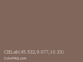 CIELab 45.532,9.077,10.33 Color is a normal orange color and the nearest color is Pastel Brown #836953. Hex code #81665b and RGB value is rgb(129,102,91). In RGB color space, this color is composed of 51% red, 40% green, 36% blue, In CMYK color space, this color is composed of 0% cyan, 21% magenta, 29% yellow , 49% black , In HSL color space, this color has a hue angle of 17° , 17% saturation and 43% lightness.