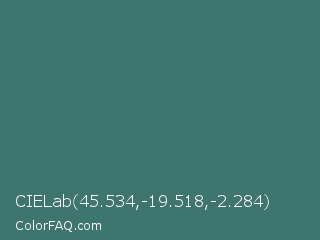 CIELab 45.534,-19.518,-2.284 Color is a normal cyan color and the nearest color is Faded Jade #427977. Hex code #3f756f and RGB value is rgb(63,117,111). In RGB color space, this color is composed of 25% red, 46% green, 44% blue, In CMYK color space, this color is composed of 46% cyan, 0% magenta, 5% yellow , 54% black , In HSL color space, this color has a hue angle of 173° , 30% saturation and 35% lightness.