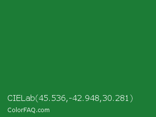 CIELab 45.536,-42.948,30.281 Color is a dark green color and the nearest color is Dark Spring Green #177245. Hex code #1c7c36 and RGB value is rgb(28,124,54). In RGB color space, this color is composed of 11% red, 49% green, 21% blue, In CMYK color space, this color is composed of 77% cyan, 0% magenta, 56% yellow , 51% black , In HSL color space, this color has a hue angle of 136° , 63% saturation and 30% lightness.