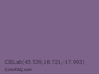 CIELab 45.539,18.721,-17.993 Color is a normal purple color and the nearest color is Rum #796989. Hex code #7d628a and RGB value is rgb(125,98,138). In RGB color space, this color is composed of 49% red, 38% green, 54% blue, In CMYK color space, this color is composed of 9% cyan, 29% magenta, 0% yellow , 46% black , In HSL color space, this color has a hue angle of 281° , 17% saturation and 46% lightness.