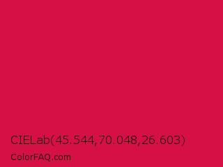 CIELab 45.544,70.048,26.603 Color is a normal rose color and the nearest color is Crimson #dc143c. Hex code #d51044 and RGB value is rgb(213,16,68). In RGB color space, this color is composed of 84% red, 6% green, 27% blue, In CMYK color space, this color is composed of 0% cyan, 92% magenta, 68% yellow , 16% black , In HSL color space, this color has a hue angle of 344° , 86% saturation and 45% lightness.