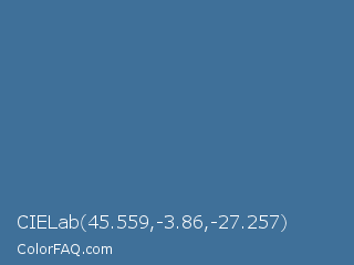 CIELab 45.559,-3.86,-27.257 Color is a normal blue color and the nearest color is Queen Blue #436b95. Hex code #3f7099 and RGB value is rgb(63,112,153). In RGB color space, this color is composed of 25% red, 44% green, 60% blue, In CMYK color space, this color is composed of 59% cyan, 27% magenta, 0% yellow , 40% black , In HSL color space, this color has a hue angle of 207° , 42% saturation and 42% lightness.