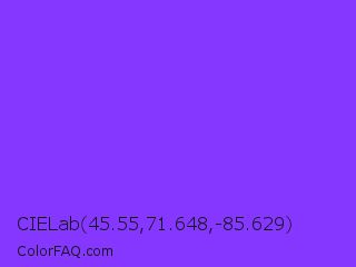 CIELab 45.55,71.648,-85.629 Color is a light violet color and the nearest color is Blue Violet #8a2be2. Hex code #8537ff and RGB value is rgb(133,55,255). In RGB color space, this color is composed of 52% red, 22% green, 100% blue, In CMYK color space, this color is composed of 48% cyan, 78% magenta, 0% yellow , 0% black , In HSL color space, this color has a hue angle of 263° , 100% saturation and 61% lightness.