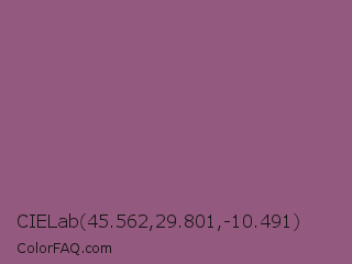CIELab 45.562,29.801,-10.491 Color is a normal magenta color and the nearest color is Antique Fuchsia #915c83. Hex code #94597e and RGB value is rgb(148,89,126). In RGB color space, this color is composed of 58% red, 35% green, 49% blue, In CMYK color space, this color is composed of 0% cyan, 40% magenta, 15% yellow , 42% black , In HSL color space, this color has a hue angle of 322° , 25% saturation and 46% lightness.
