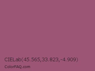 CIELab 45.565,33.823,-4.909 Color is a normal rose color and the nearest color is Rose Dust #9e5e6f. Hex code #9d5575 and RGB value is rgb(157,85,117). In RGB color space, this color is composed of 62% red, 33% green, 46% blue, In CMYK color space, this color is composed of 0% cyan, 46% magenta, 25% yellow , 38% black , In HSL color space, this color has a hue angle of 333° , 30% saturation and 47% lightness.
