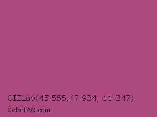CIELab 45.565,47.934,-11.347 Color is a normal magenta color and the nearest color is Mystic Maroon #ad4379. Hex code #ad4780 and RGB value is rgb(173,71,128). In RGB color space, this color is composed of 68% red, 28% green, 50% blue, In CMYK color space, this color is composed of 0% cyan, 59% magenta, 26% yellow , 32% black , In HSL color space, this color has a hue angle of 326° , 42% saturation and 48% lightness.