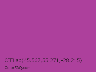 CIELab 45.567,55.271,-28.215 Color is a normal magenta color and the nearest color is Byzantine #bd33a4. Hex code #ad409c and RGB value is rgb(173,64,156). In RGB color space, this color is composed of 68% red, 25% green, 61% blue, In CMYK color space, this color is composed of 0% cyan, 63% magenta, 10% yellow , 32% black , In HSL color space, this color has a hue angle of 309° , 46% saturation and 46% lightness.