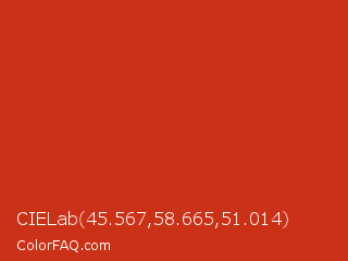CIELab 45.567,58.665,51.014 Color is a normal red color and the nearest color is Thunderbird #c02b18. Hex code #cb3116 and RGB value is rgb(203,49,22). In RGB color space, this color is composed of 80% red, 19% green, 9% blue, In CMYK color space, this color is composed of 0% cyan, 76% magenta, 89% yellow , 20% black , In HSL color space, this color has a hue angle of 9° , 80% saturation and 44% lightness.