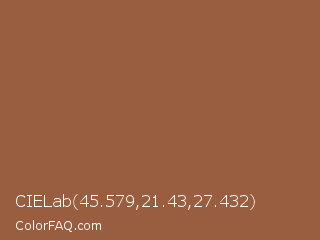 CIELab 45.579,21.43,27.432 Color is a normal orange color and the nearest color is Coconut #965a3e. Hex code #995d3f and RGB value is rgb(153,93,63). In RGB color space, this color is composed of 60% red, 36% green, 25% blue, In CMYK color space, this color is composed of 0% cyan, 39% magenta, 59% yellow , 40% black , In HSL color space, this color has a hue angle of 20° , 42% saturation and 42% lightness.