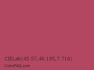 CIELab 45.57,46.195,7.716 Color is a normal red color and the nearest color is Hippie Pink #ae4560. Hex code #b34761 and RGB value is rgb(179,71,97). In RGB color space, this color is composed of 70% red, 28% green, 38% blue, In CMYK color space, this color is composed of 0% cyan, 60% magenta, 46% yellow , 30% black , In HSL color space, this color has a hue angle of 346° , 43% saturation and 49% lightness.