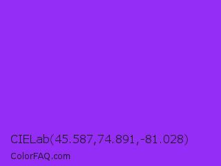 CIELab 45.587,74.891,-81.028 Color is a normal violet color and the nearest color is Veronica #a020f0. Hex code #942ef7 and RGB value is rgb(148,46,247). In RGB color space, this color is composed of 58% red, 18% green, 97% blue, In CMYK color space, this color is composed of 40% cyan, 81% magenta, 0% yellow , 3% black , In HSL color space, this color has a hue angle of 270° , 93% saturation and 57% lightness.