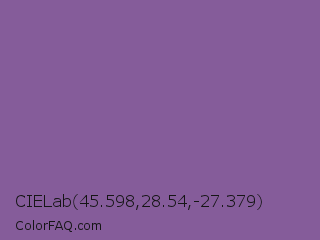 CIELab 45.598,28.54,-27.379 Color is a normal purple color and the nearest color is Trendy Pink #8c6495. Hex code #855c9a and RGB value is rgb(133,92,154). In RGB color space, this color is composed of 52% red, 36% green, 60% blue, In CMYK color space, this color is composed of 14% cyan, 40% magenta, 0% yellow , 40% black , In HSL color space, this color has a hue angle of 280° , 25% saturation and 48% lightness.