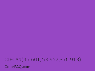 CIELab 45.601,53.957,-51.913 Color is a normal purple color and the nearest color is Deep Lilac #9955bb. Hex code #9647c4 and RGB value is rgb(150,71,196). In RGB color space, this color is composed of 59% red, 28% green, 77% blue, In CMYK color space, this color is composed of 23% cyan, 64% magenta, 0% yellow , 23% black , In HSL color space, this color has a hue angle of 278° , 51% saturation and 52% lightness.