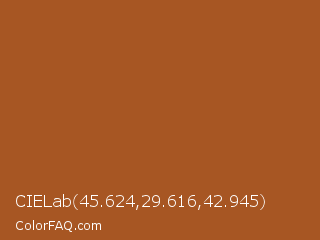 CIELab 45.624,29.616,42.945 Color is a normal orange color and the nearest color is Paarl #a65529. Hex code #a75623 and RGB value is rgb(167,86,35). In RGB color space, this color is composed of 65% red, 34% green, 14% blue, In CMYK color space, this color is composed of 0% cyan, 49% magenta, 79% yellow , 35% black , In HSL color space, this color has a hue angle of 23° , 65% saturation and 40% lightness.