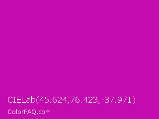 CIELab 45.624,76.423,-37.971 Color is a normal magenta color and the nearest color is Heliotrope Magenta #aa00bb. Hex code #c40bad and RGB value is rgb(196,11,173). In RGB color space, this color is composed of 77% red, 4% green, 68% blue, In CMYK color space, this color is composed of 0% cyan, 94% magenta, 12% yellow , 23% black , In HSL color space, this color has a hue angle of 307° , 89% saturation and 41% lightness.