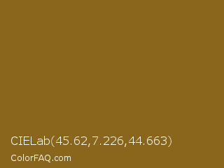 CIELab 45.62,7.226,44.663 Color is a normal orange color and the nearest color is Kumera #886221. Hex code #8a661c and RGB value is rgb(138,102,28). In RGB color space, this color is composed of 54% red, 40% green, 11% blue, In CMYK color space, this color is composed of 0% cyan, 26% magenta, 80% yellow , 46% black , In HSL color space, this color has a hue angle of 40° , 66% saturation and 33% lightness.