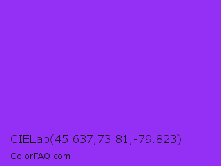 CIELab 45.637,73.81,-79.823 Color is a normal violet color and the nearest color is Veronica #a020f0. Hex code #9430f5 and RGB value is rgb(148,48,245). In RGB color space, this color is composed of 58% red, 19% green, 96% blue, In CMYK color space, this color is composed of 40% cyan, 80% magenta, 0% yellow , 4% black , In HSL color space, this color has a hue angle of 270° , 91% saturation and 57% lightness.