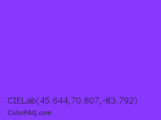 CIELab 45.644,70.807,-83.792 Color is a normal violet color and the nearest color is Blue Violet #8a2be2. Hex code #8738fc and RGB value is rgb(135,56,252). In RGB color space, this color is composed of 53% red, 22% green, 99% blue, In CMYK color space, this color is composed of 46% cyan, 78% magenta, 0% yellow , 1% black , In HSL color space, this color has a hue angle of 264° , 97% saturation and 60% lightness.