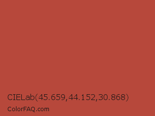 CIELab 45.659,44.152,30.868 Color is a normal red color and the nearest color is Mojo #c04737. Hex code #b7483b and RGB value is rgb(183,72,59). In RGB color space, this color is composed of 72% red, 28% green, 23% blue, In CMYK color space, this color is composed of 0% cyan, 61% magenta, 68% yellow , 28% black , In HSL color space, this color has a hue angle of 6° , 51% saturation and 47% lightness.