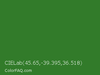 CIELab 45.65,-39.395,36.518 Color is a normal green color and the nearest color is Bilbao #327c14. Hex code #327b2a and RGB value is rgb(50,123,42). In RGB color space, this color is composed of 20% red, 48% green, 16% blue, In CMYK color space, this color is composed of 59% cyan, 0% magenta, 66% yellow , 52% black , In HSL color space, this color has a hue angle of 114° , 49% saturation and 32% lightness.