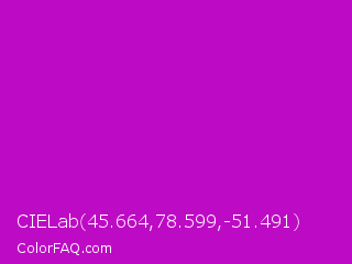 CIELab 45.664,78.599,-51.491 Color is a normal magenta color and the nearest color is Deep Magenta #cc00cc. Hex code #bd0ac4 and RGB value is rgb(189,10,196). In RGB color space, this color is composed of 74% red, 4% green, 77% blue, In CMYK color space, this color is composed of 4% cyan, 95% magenta, 0% yellow , 23% black , In HSL color space, this color has a hue angle of 298° , 90% saturation and 40% lightness.