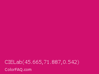 CIELab 45.665,71.887,0.542 Color is a normal rose color and the nearest color is Dogwood Rose #d71868. Hex code #d10f6e and RGB value is rgb(209,15,110). In RGB color space, this color is composed of 82% red, 6% green, 43% blue, In CMYK color space, this color is composed of 0% cyan, 93% magenta, 47% yellow , 18% black , In HSL color space, this color has a hue angle of 331° , 87% saturation and 44% lightness.