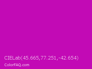 CIELab 45.665,77.251,-42.654 Color is a normal magenta color and the nearest color is Heliotrope Magenta #aa00bb. Hex code #c20ab5 and RGB value is rgb(194,10,181). In RGB color space, this color is composed of 76% red, 4% green, 71% blue, In CMYK color space, this color is composed of 0% cyan, 95% magenta, 7% yellow , 24% black , In HSL color space, this color has a hue angle of 304° , 90% saturation and 40% lightness.