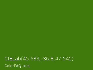 CIELab 45.683,-36.8,47.541 Color is a dark green color and the nearest color is Bilbao #327c14. Hex code #407a0c and RGB value is rgb(64,122,12). In RGB color space, this color is composed of 25% red, 48% green, 5% blue, In CMYK color space, this color is composed of 48% cyan, 0% magenta, 90% yellow , 52% black , In HSL color space, this color has a hue angle of 92° , 82% saturation and 26% lightness.