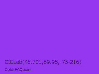 CIELab 45.701,69.95,-75.216 Color is a normal purple color and the nearest color is Blue Violet #8a2be2. Hex code #9436ed and RGB value is rgb(148,54,237). In RGB color space, this color is composed of 58% red, 21% green, 93% blue, In CMYK color space, this color is composed of 38% cyan, 77% magenta, 0% yellow , 7% black , In HSL color space, this color has a hue angle of 271° , 84% saturation and 57% lightness.