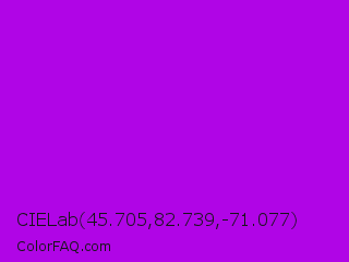 CIELab 45.705,82.739,-71.077 Color is a normal purple color and the nearest color is Vivid Mulberry #b80ce3. Hex code #b005e6 and RGB value is rgb(176,5,230). In RGB color space, this color is composed of 69% red, 2% green, 90% blue, In CMYK color space, this color is composed of 23% cyan, 98% magenta, 0% yellow , 10% black , In HSL color space, this color has a hue angle of 286° , 96% saturation and 46% lightness.