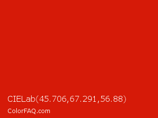 CIELab 45.706,67.291,56.88 Color is a normal red color and the nearest color is Maximum Red #d92121. Hex code #d61a08 and RGB value is rgb(214,26,8). In RGB color space, this color is composed of 84% red, 10% green, 3% blue, In CMYK color space, this color is composed of 0% cyan, 88% magenta, 96% yellow , 16% black , In HSL color space, this color has a hue angle of 5° , 93% saturation and 44% lightness.