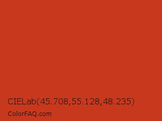 CIELab 45.708,55.128,48.235 Color is a normal red color and the nearest color is Dark Pastel Red #c23b22. Hex code #c7381c and RGB value is rgb(199,56,28). In RGB color space, this color is composed of 78% red, 22% green, 11% blue, In CMYK color space, this color is composed of 0% cyan, 72% magenta, 86% yellow , 22% black , In HSL color space, this color has a hue angle of 10° , 75% saturation and 45% lightness.
