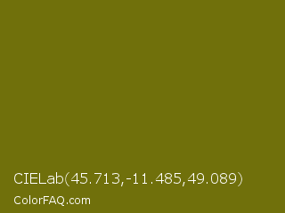 CIELab 45.713,-11.485,49.089 Color is a dark yellow color and the nearest color is Olivetone #716e10. Hex code #70700b and RGB value is rgb(112,112,11). In RGB color space, this color is composed of 44% red, 44% green, 4% blue, In CMYK color space, this color is composed of 0% cyan, 0% magenta, 90% yellow , 56% black , In HSL color space, this color has a hue angle of 60° , 82% saturation and 24% lightness.