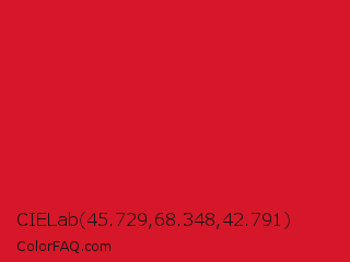 CIELab 45.729,68.348,42.791 Color is a normal red color and the nearest color is Amaranth Red #d3212d. Hex code #d61729 and RGB value is rgb(214,23,41). In RGB color space, this color is composed of 84% red, 9% green, 16% blue, In CMYK color space, this color is composed of 0% cyan, 89% magenta, 81% yellow , 16% black , In HSL color space, this color has a hue angle of 354° , 81% saturation and 46% lightness.