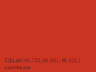 CIELab 45.735,56.951,46.051 Color is a normal red color and the nearest color is Dark Pastel Red #c23b22. Hex code #c93521 and RGB value is rgb(201,53,33). In RGB color space, this color is composed of 79% red, 21% green, 13% blue, In CMYK color space, this color is composed of 0% cyan, 74% magenta, 84% yellow , 21% black , In HSL color space, this color has a hue angle of 7° , 72% saturation and 46% lightness.