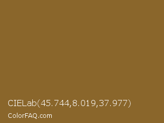 CIELab 45.744,8.019,37.977 Color is a normal orange color and the nearest color is Kumera #886221. Hex code #8a662b and RGB value is rgb(138,102,43). In RGB color space, this color is composed of 54% red, 40% green, 17% blue, In CMYK color space, this color is composed of 0% cyan, 26% magenta, 69% yellow , 46% black , In HSL color space, this color has a hue angle of 37° , 52% saturation and 35% lightness.