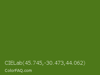 CIELab 45.745,-30.473,44.062 Color is a dark green color and the nearest color is Sap Green #507d2a. Hex code #4d7819 and RGB value is rgb(77,120,25). In RGB color space, this color is composed of 30% red, 47% green, 10% blue, In CMYK color space, this color is composed of 36% cyan, 0% magenta, 79% yellow , 53% black , In HSL color space, this color has a hue angle of 87° , 66% saturation and 28% lightness.