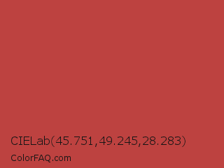 CIELab 45.751,49.245,28.283 Color is a normal red color and the nearest color is Mojo #c04737. Hex code #bd4240 and RGB value is rgb(189,66,64). In RGB color space, this color is composed of 74% red, 26% green, 25% blue, In CMYK color space, this color is composed of 0% cyan, 65% magenta, 66% yellow , 26% black , In HSL color space, this color has a hue angle of 1° , 49% saturation and 50% lightness.