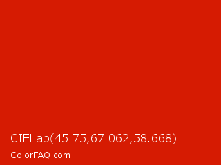 CIELab 45.75,67.062,58.668 Color is a normal red color and the nearest color is Rosso Corsa #d40000. Hex code #d61b02 and RGB value is rgb(214,27,2). In RGB color space, this color is composed of 84% red, 11% green, 1% blue, In CMYK color space, this color is composed of 0% cyan, 87% magenta, 99% yellow , 16% black , In HSL color space, this color has a hue angle of 7° , 98% saturation and 42% lightness.