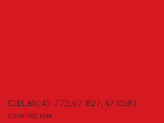 CIELab 45.773,67.827,47.058 Color is a normal red color and the nearest color is Maximum Red #d92121. Hex code #d61921 and RGB value is rgb(214,25,33). In RGB color space, this color is composed of 84% red, 10% green, 13% blue, In CMYK color space, this color is composed of 0% cyan, 88% magenta, 85% yellow , 16% black , In HSL color space, this color has a hue angle of 357° , 79% saturation and 47% lightness.