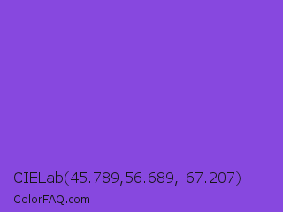 CIELab 45.789,56.689,-67.207 Color is a normal violet color and the nearest color is Navy Purple #9457eb. Hex code #8748df and RGB value is rgb(135,72,223). In RGB color space, this color is composed of 53% red, 28% green, 87% blue, In CMYK color space, this color is composed of 39% cyan, 68% magenta, 0% yellow , 13% black , In HSL color space, this color has a hue angle of 265° , 70% saturation and 58% lightness.