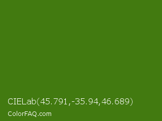 CIELab 45.791,-35.94,46.689 Color is a dark green color and the nearest color is Green Leaf #436a0d. Hex code #427a10 and RGB value is rgb(66,122,16). In RGB color space, this color is composed of 26% red, 48% green, 6% blue, In CMYK color space, this color is composed of 46% cyan, 0% magenta, 87% yellow , 52% black , In HSL color space, this color has a hue angle of 92° , 77% saturation and 27% lightness.