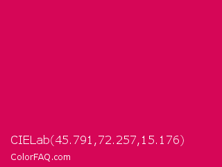 CIELab 45.791,72.257,15.176 Color is a normal rose color and the nearest color is Debian Red #d70a53. Hex code #d60657 and RGB value is rgb(214,6,87). In RGB color space, this color is composed of 84% red, 2% green, 34% blue, In CMYK color space, this color is composed of 0% cyan, 97% magenta, 59% yellow , 16% black , In HSL color space, this color has a hue angle of 337° , 95% saturation and 43% lightness.