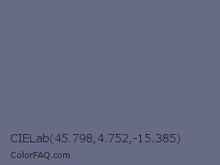 CIELab 45.798,4.752,-15.385 Color is a normal blue color and the nearest color is Storm Gray #717486. Hex code #676b86 and RGB value is rgb(103,107,134). In RGB color space, this color is composed of 40% red, 42% green, 53% blue, In CMYK color space, this color is composed of 23% cyan, 20% magenta, 0% yellow , 47% black , In HSL color space, this color has a hue angle of 232° , 13% saturation and 46% lightness.